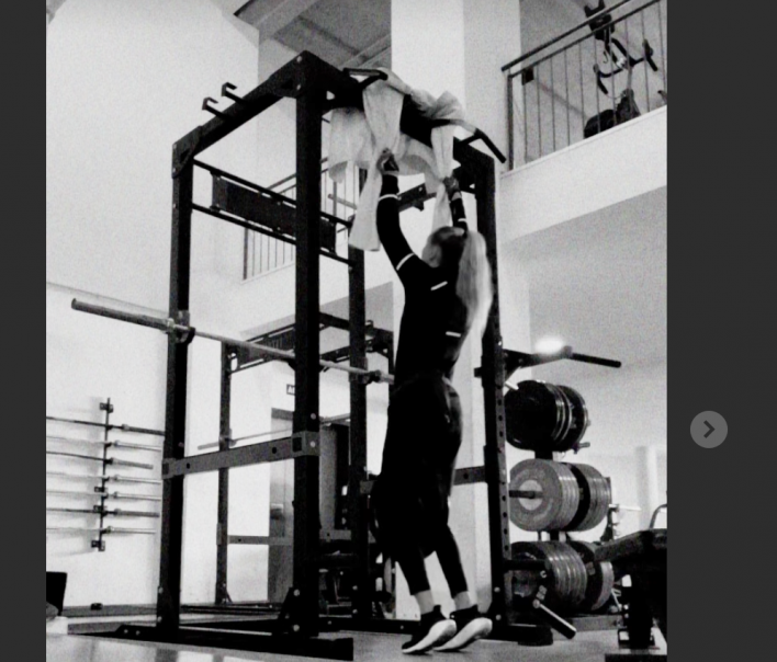 1、タオルを握ってぶら下がり、腰にはバーベルプレート(ビロディド インスタストーリーズより)