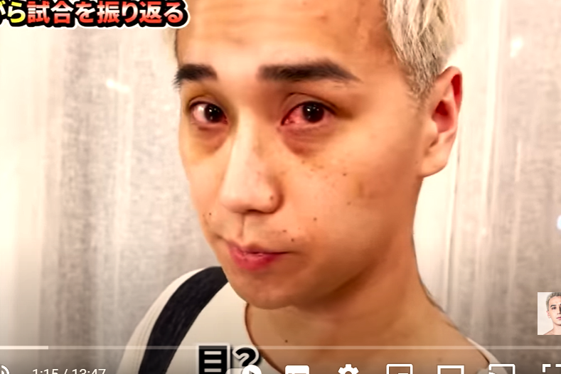 こめおは、充血した左目をカメラに向けた(こめお公式YouTubeチャンネルより)