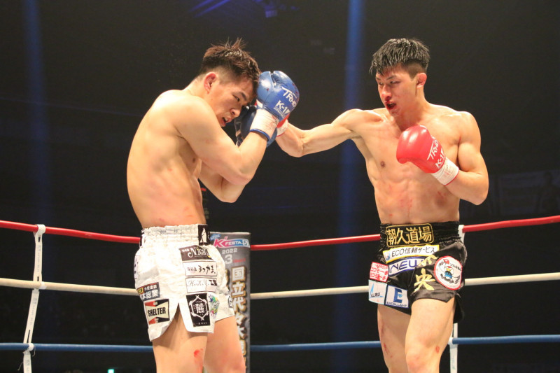 前回の対戦で朝久(右)は、与座(左)に右を入れて行った
