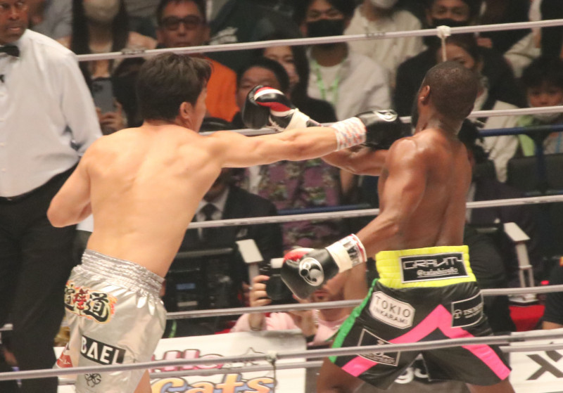 この右ストレートがクリーンヒット!メイウェザー の顔が大きく揺れた(Takuji Yoshikura)