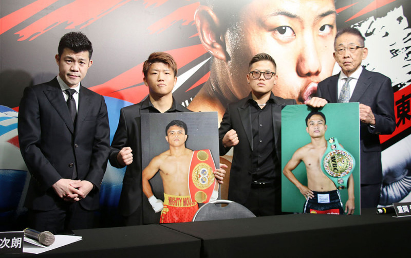対戦相手の写真を持つ重岡銀次朗(中央左)と優大(中央右)、亀田興毅ファウンダー(左)、渡辺均会長(右)