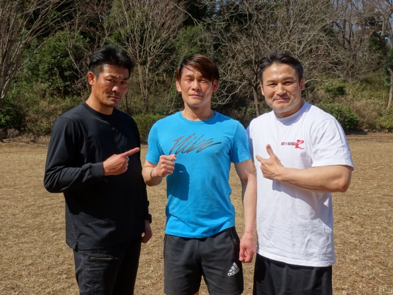 プロレスラーとなった町田光(中央)がミノワマン(右)と特訓を慣行(左は坂口征夫)