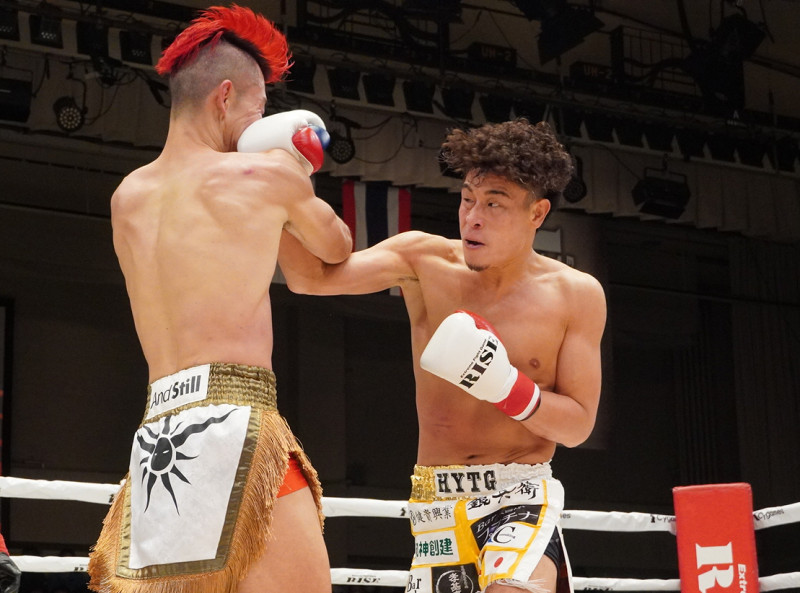 気迫の表情でパンチを当てるKENTA