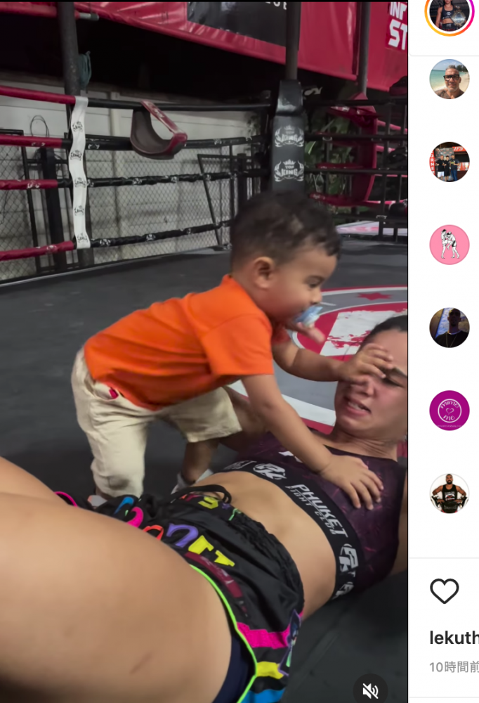 腹筋トレを行うアリシアに息子が母の顔おおさえて割って入り.@allycia_phuketfightclubより