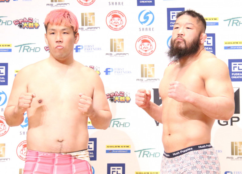 京太郎(左)と石井(右)がド迫力対決で明日の大会を盛り上げる