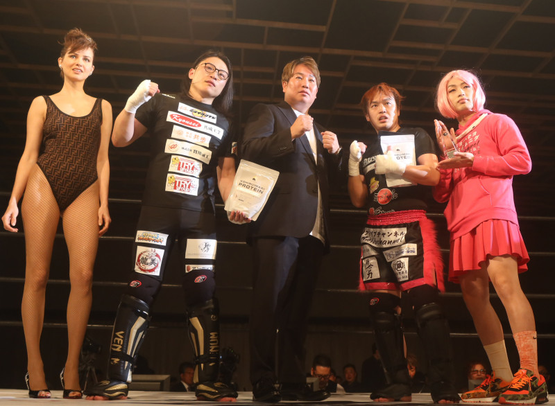 にがうり社長(右から2人目)がメガネ社長(左から2人目)に勝利。右はアドリブまさお