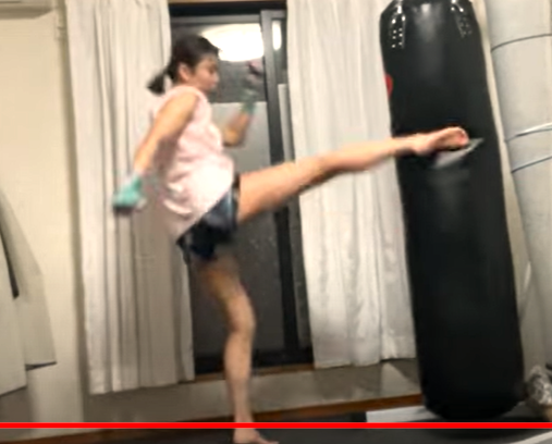 自宅のサンドバッグに蹴りを出すぱんちゃん(『ぱんチャンネル_ぱんちゃん璃奈』)