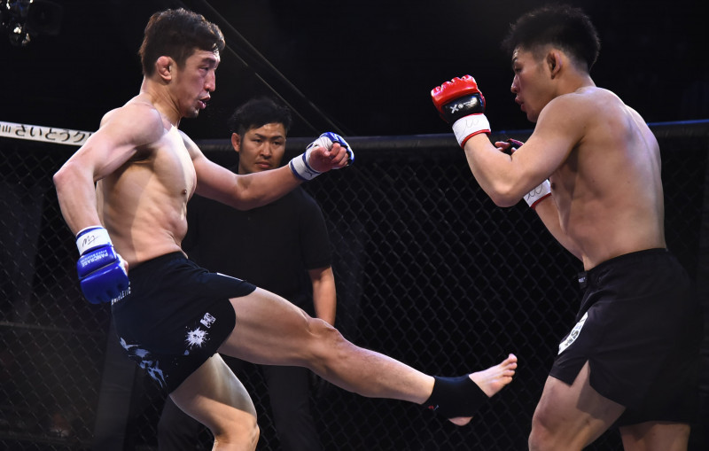 松本(左)は松岡嵩志(右)を右フックでKOした(21年12月12日、パンクラス325)