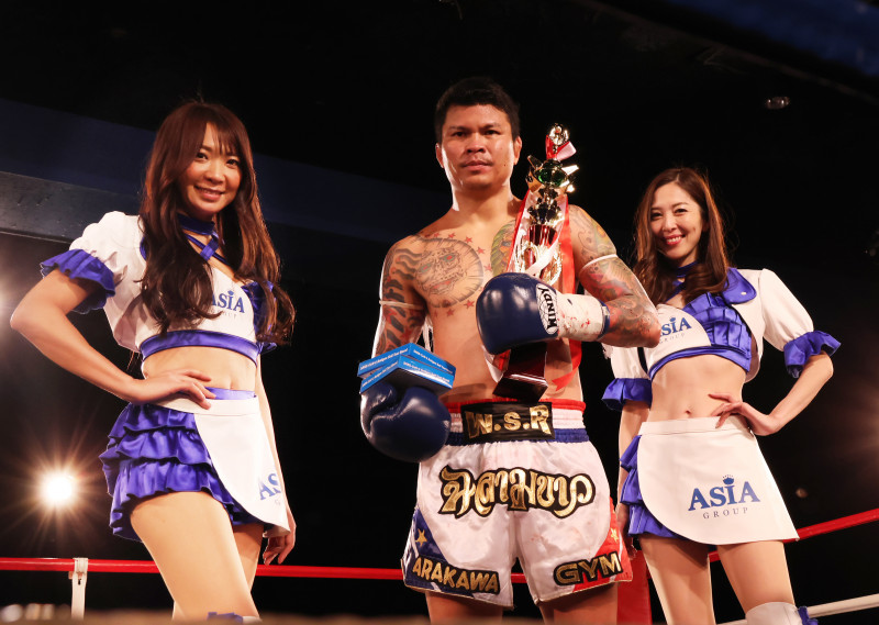 左からラウンドガールを務めたレースクイーンの山田優子、昼の部でTKO勝ちしたムエタイ強豪スーパーボーイ、朝倉あや