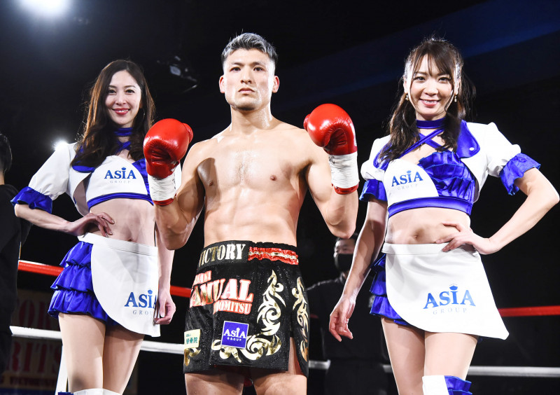 左からラウンドガールを務めたレースクイーンの朝倉あや、KO勝ちしたWMCムエタイ王者永澤サムエル聖光、山田優子