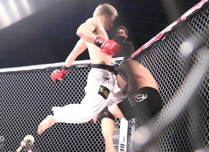 前回のブレイキングダウンであつき(左)は、飛びヒザ蹴りでダウンを奪った