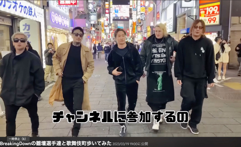 歌舞伎町を歩く朝倉未来(中央)らコワモテ軍団(朝倉未来YouTubeより)