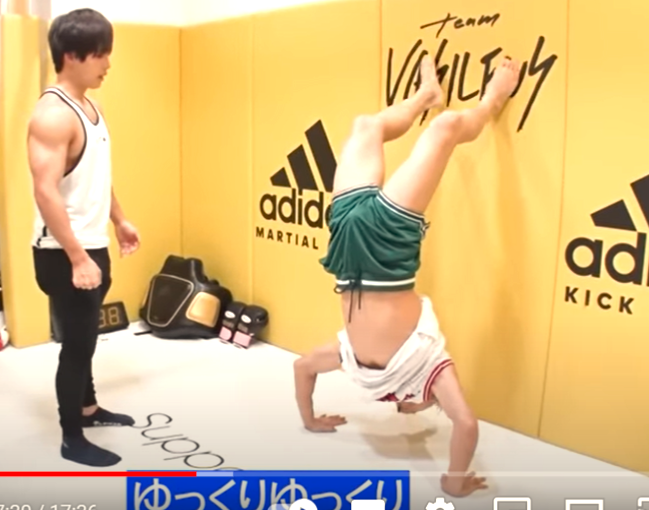 ぷろたんは、逆立ちの腕立て伏せで胸の上部の筋肉を鍛えるトレを伝授(YouTubeチャンネル『武尊 / TAKERU』より)