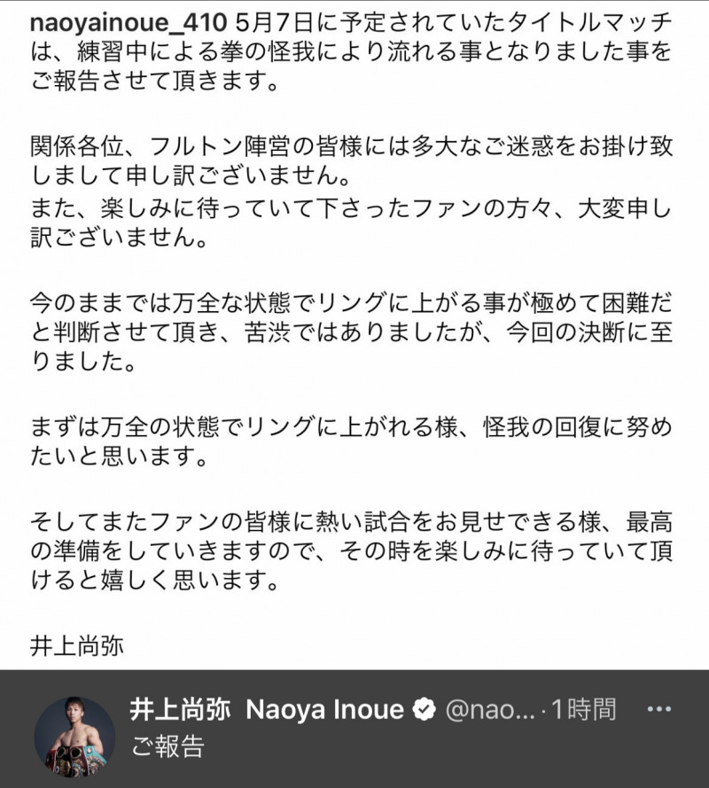 井上尚弥が謝罪したツイート @naoyainoue_410