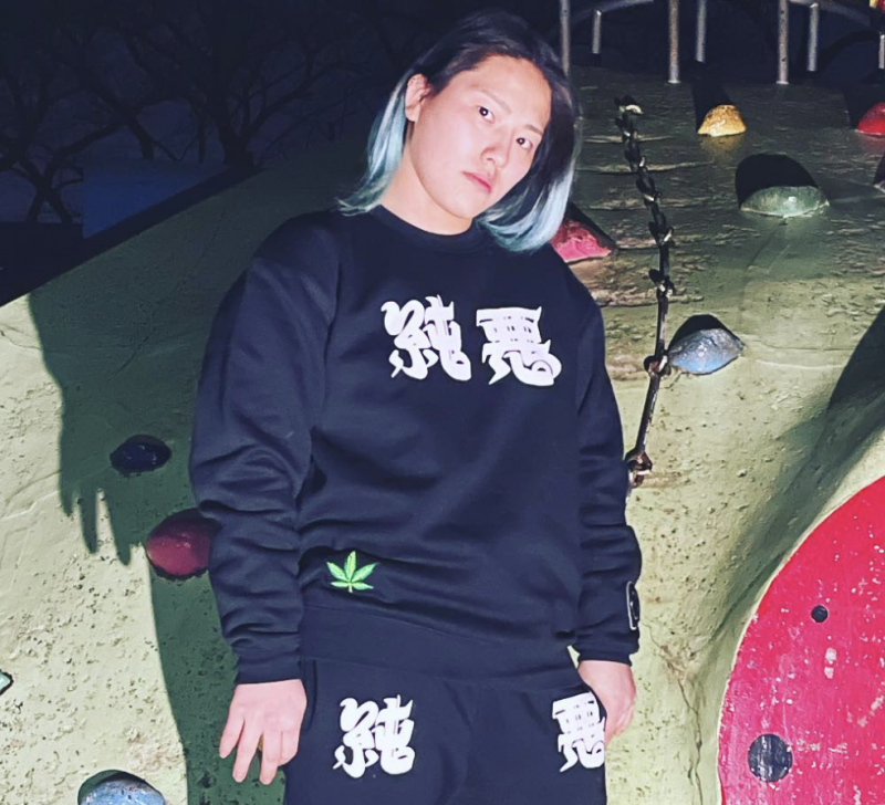 大麻のマークが入る”純悪”トレーナーを着るKINGレイナ(本人のインスタより)