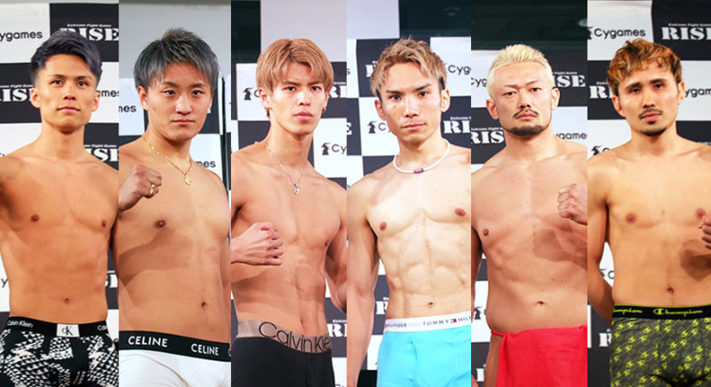 「RISE×K-1対抗戦」に出場する、左から門口佳佑、南原健太、白鳥大珠、佐々木大蔵、愛鷹亮、新美貴士
