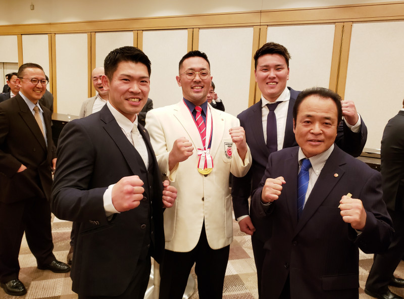 全日本三連覇の入来建武(中央)と島本雄二上田幹雄と、入来の父である入来支部長(右)