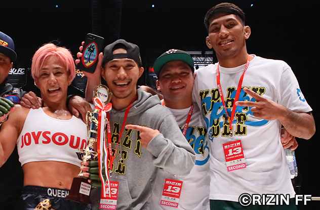 山本美憂(左)の勝利をアーセン(左から2番目)らと共に喜ぶアグォン(右)