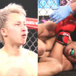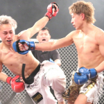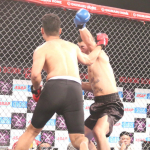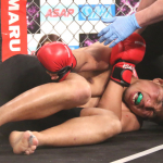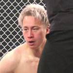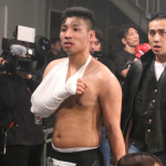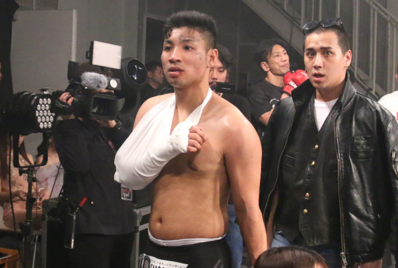 右腕を吊って引き上げる行虎、セコンドのこめお