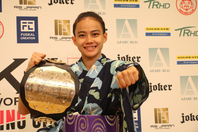 K-1チャンピオンになった一夜明け会見で、パヤーフォンは浴衣姿を披露した
