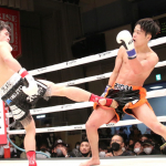 前回の2人の対戦では、大﨑のこのローキックが金的攻撃となってしまった