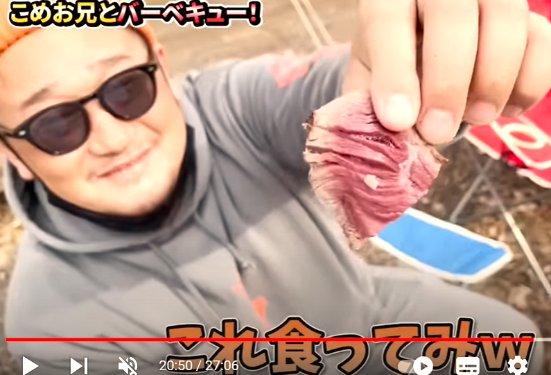 こめお兄が、生焼けの肉をスタッフに食べさせようとする場面も(YouTube『こめおチャンネル』より)