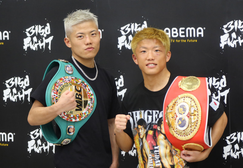 W世界暫定王座を獲得した重岡兄弟。兄の優大(左)に対し、ダウンの応酬の激闘となった弟・銀次朗の顔は腫れる=試合後会見にて
