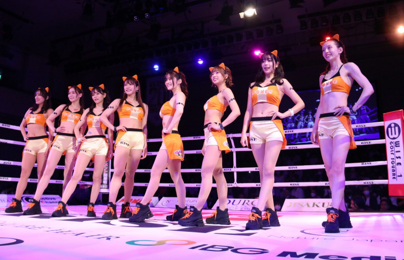 今年度のRISEラウンドガール8人、宮原(右)もリング上に並んだ