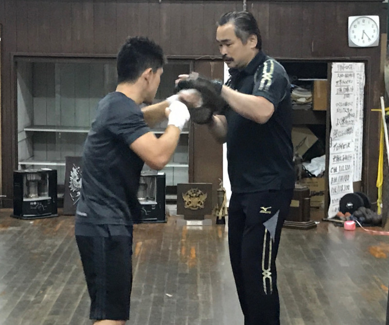 西沢良徳トレーナーがヨネクラジム最後の王者となった溜田のミットを持つ