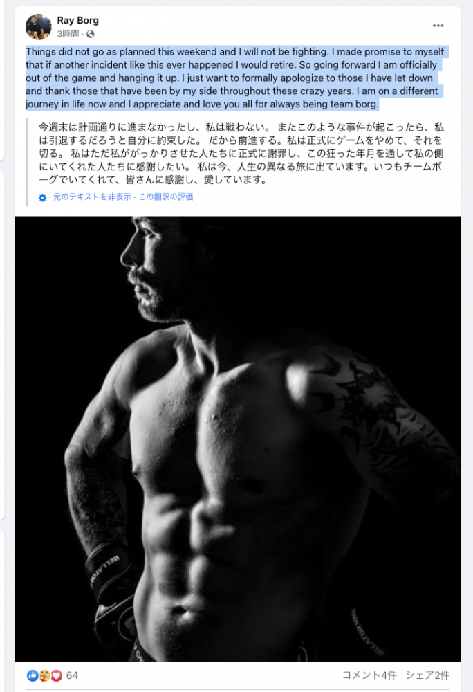 ボーグが引退発表に使ったマッスル写真と引退内容全文(日本語は機械翻訳)
