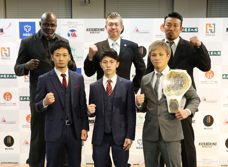第1回キックボクシングワールド杯開催会見で後列左からホースト、佐竹、武蔵が登壇。前列左から麻原将平、吉成名高、泰良拓也