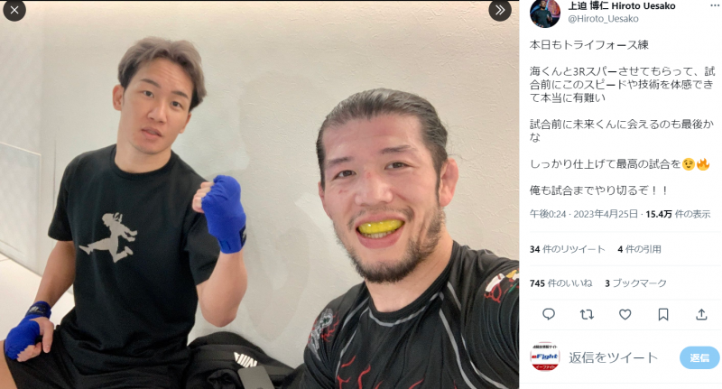 おそらく最後の練習後、練習仲間の上迫(右)とガッツポーズ @Hiroto_Uesako