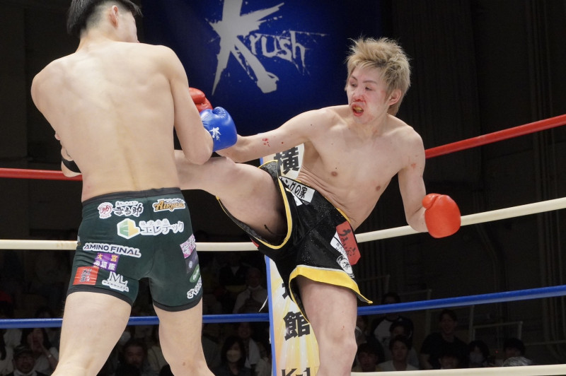 意地で前に出る塚本(右)
