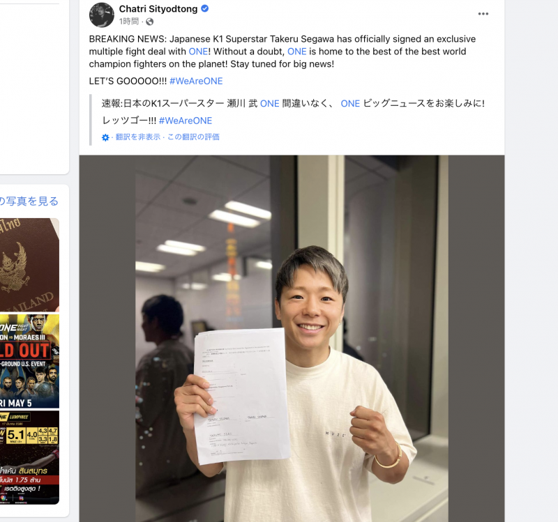 チャトリCEOがFacebookで武尊と複数試合契約したと報告。ONEの契約書を持つ武尊