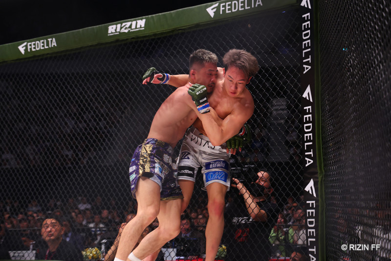ケージ際に朝倉を押し込む牛久