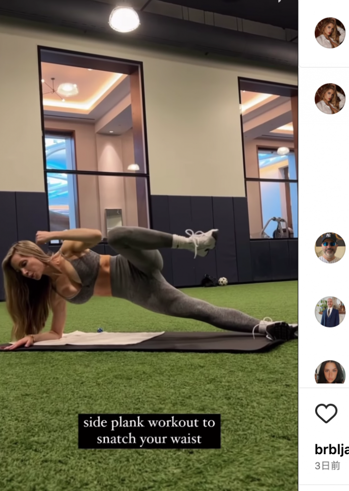 サイドプランクで脇腹の締めを行うアマンダ@amandaeliseleeより