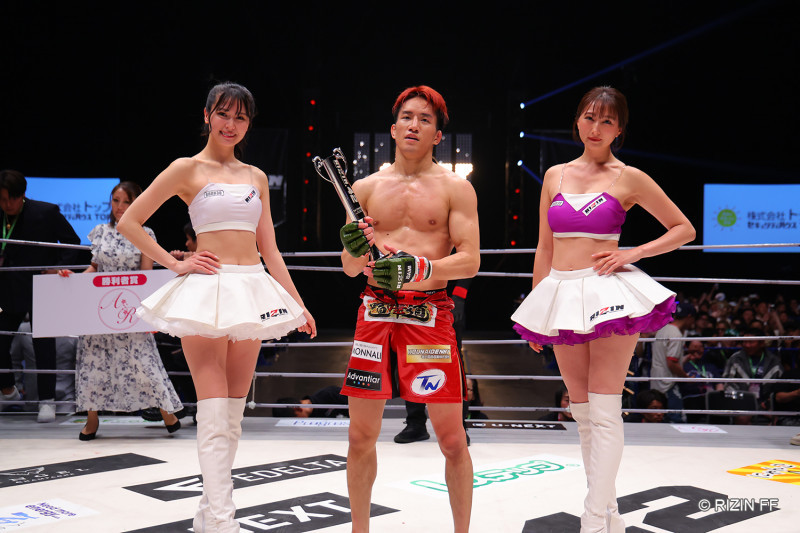 朝倉海と注目の長身8頭身ラウンドガール2人、左・荒井つかさ、右・鞠奈
