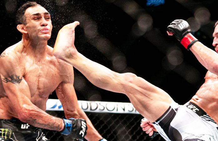 昨年5月には、チャンドラーの顔面前蹴りで失神KO負けを喫したファーガソン(左)©️UFC