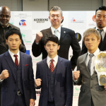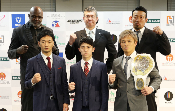 第1回キックボクシングワールドカップ開催会見にて、後列左からホースト、佐竹、武蔵。前列左から麻原将平、吉成名高、泰良拓也