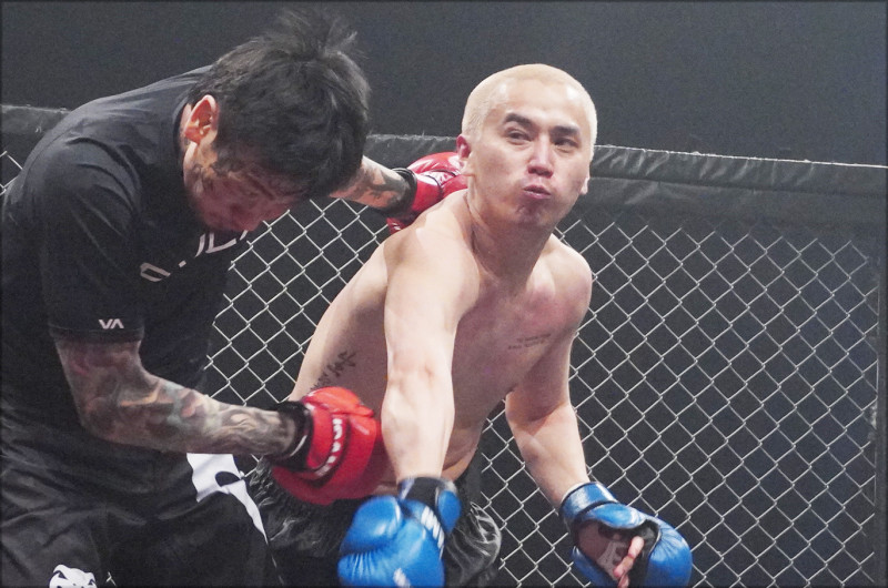試合で瓜田にパンチをヒットさせるこめお