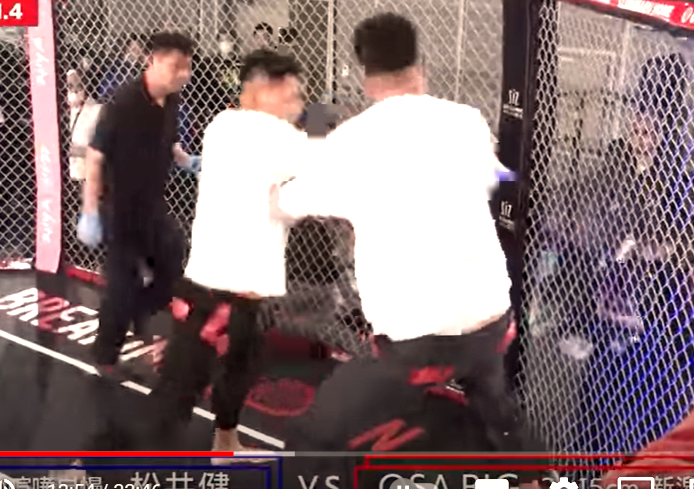 身長2メートル15センチのOSA BIG(右)をKOする松井(左)(『朝倉未来』YouTubeチャンネル)