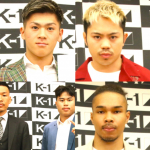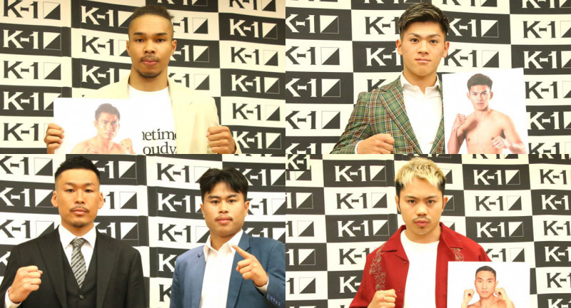 K-1両国大会の対戦カードが発表された。左上から時計回りに、ジョムトーンvs寧仁太、斗麗vsヴュー、不可思vsジン・シジュン、鈴木勇人vsデンサヤーム