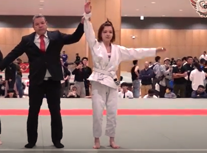 中村K太郎の“K太郎ポーズ”を取るあきぴ(『ASJJF公式チャンネル』)