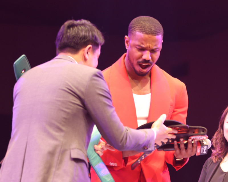山中からジョーダンにクリード特製ベルトが送られると、ジョーダンはこの驚きの表情
