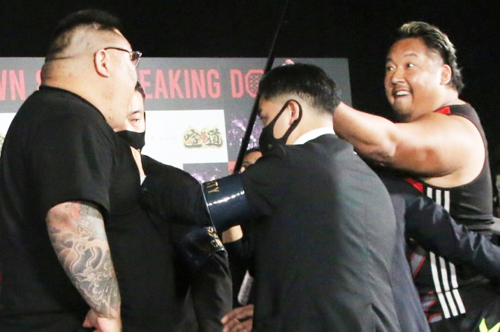 ノッコン(右)がジェフン(左)に前蹴りで攻撃し、乱闘騒ぎに