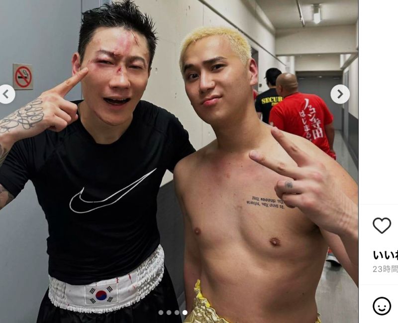 顔面負傷のユジン(左)と笑顔のこめお(右)comeo_comel
