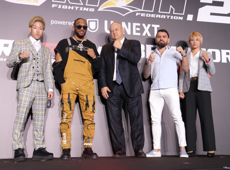 (左から)会見に出席した神龍誠、AJ・マッキー、Bellatorスコット・コーカー代表、パトリッキー・ピットブル・フレイレ、渡辺華奈