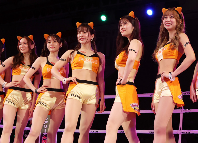 猫耳姿のRIISEラウンドガール、左からセラ、ぽぽちゃん、桜りん、高橋凛、大貫彩香。高橋以外の4人はこの衣装でレースクイーンも務める