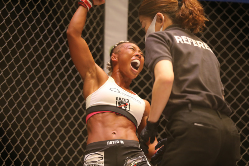 勝利のガッツポーズ!バキバキの腹筋(写真は22年9月の原田よき戦)