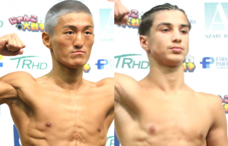 黒田(左)がバキバキボディで計量パス、16歳ラマダン(右)の肉体